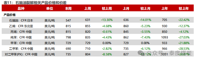 炼化产品价格和价差表现