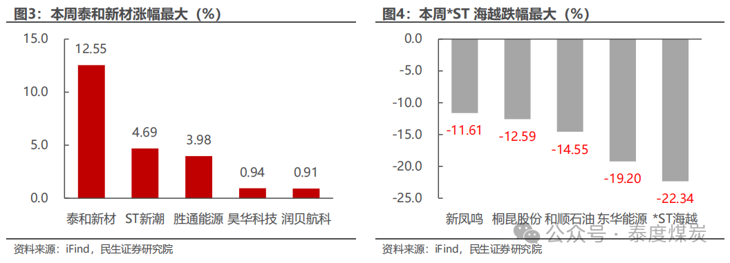 本周泰和新材涨幅最大。截至4月11日,石油石化行业中,公司周涨跌幅前5位分别为:泰和新材上涨12.55%,ST新潮上涨4.69%,胜通能源上涨3.98%,昊华科技上涨0.94%,润贝航科上涨0.91%。