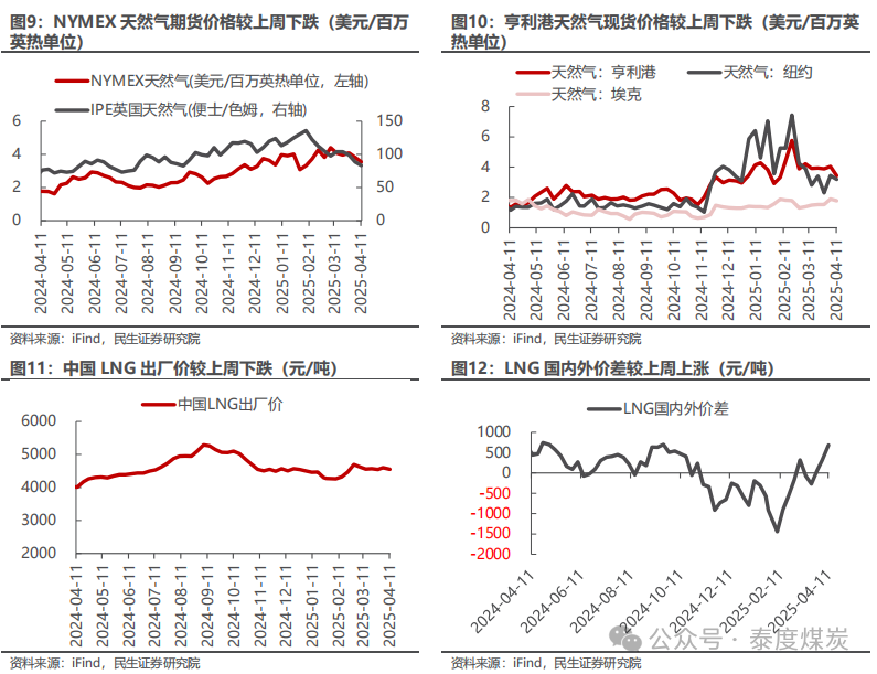 截至2025年1月3日,NYMEX天然气期货收盘价为3.37美元/百万英热单位,较上周下跌7.47%;截至2025年1月3日,亨利港天然气现货价格为3.47美元/百万英热单位,较上周上涨17.06%;截至2025年1月3日,中国LNG出厂价为4501元/吨,较上周下跌0.92%。