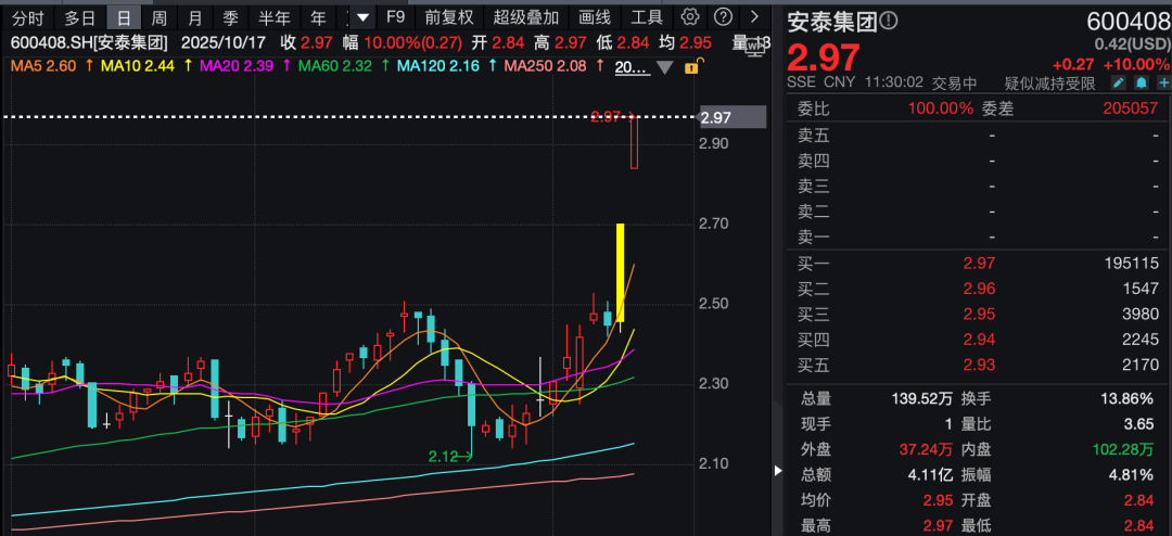 今日早盘,A股震荡调整,上证指数跌破3900点,深证成指亦失守13000点,创业板指也未能保住3000点,科创50则击穿1400点,创阶段性新低。市场超4100只个股下跌,成交有进一步萎缩的趋势。盘面上,林业、贵金属、创新药、煤炭等板块相对活跃,光伏设备、消费电子、地面兵装、通信设备等板块跌幅居前。港股市场,药捷安康在昨日大涨46.34%的基础上,今日早间再度直线拉升,盘中最多一度涨逾35%,2日累计涨幅接近100%。轩竹生物、三叶草生物、康宁杰瑞制药等涨幅也超10%。为期5日的“2025年欧洲肿瘤年会(ESMO)”今日召开,ESMO官网信息显示,有23项来自中国的研究入选最新突破摘要(LBA),相较2024年的7项大幅增加,显示出我国创新药产业发展的强劲趋势,LBA汇报包括康方生物AK112、科伦博泰SKB264、荣昌生物RC148联合疗法、恒瑞医药SHR-A1811、百利天恒BL-B01D1以及康宁杰瑞KN026等重点研究。此外,昨日,北京市政府新闻办举行新闻发布会,介绍北京市全面深化药品医疗器械监管改革,促进医药产业高质量发展工作情况。北京市连续两年出台支持创新医药发展的“32条”措施,并滚动实施医药健康协同创新三年行动计划。优化创新药临床试验审评审批试点,临床试验审批时限从60日压缩至30日,14个项目纳入试点,最快18个工作日获批,1周启动试验。方正证券表示,仍然坚定看好创新产业链长牛行情。创新药出海已成趋势,年底预期将有更多BD兑现,仍然坚定看好创新板块行情,重仓BD确定性。煤炭股今日继续保持强势,板块指数日K线连续8日走阳,再创年内新高。大有能源(600403)高开后秒速涨停,收获6天5板涨停,股价创2016年6月以来9年多新高(复权);安泰集团亦秒速封板,连续第2日涨停,股价创近2年新高;宝泰隆、云煤能源等多股也一度冲击涨停,并创阶段性新高。中央气象台预计,今起至19日,有较强冷空气自西向东先后影响我国,大部地区平均气温累计下降4~8℃。其中,内蒙古中西部、华北北部、东北地区南部以及湖南、贵州等地部分地区降温10℃以上,局地超过12℃;新疆、黑龙江、内蒙古多地迎来降雪并出现积雪,新疆天池积雪深度达到13厘米。受冷空气影响,北方多地开始供暖。吉林省10月17日起多地最低气温跌破冰点,长春、松原等十余市(区)提前开栓供暖,全省计划在10月20日前实现全域供暖。黑龙江哈尔滨市、鸡西市、鹤岗市、七台河市、大庆市、佳木斯市、黑河市已全面启动供暖,确保10月20日前室内温度达标。中信证券认为,跟踪的样本煤炭上市公司,第三季度净利润平均环比增长约18%。环比而言,焦煤、无烟煤公司业绩预期弹性更大,但动力煤板块贡献利润依然最多。展望四季度,行业整体供需平衡,旺季或出现阶段性供给缺口,若“反内卷”政策执行力度强化,煤价有望超预期改善。