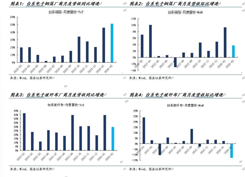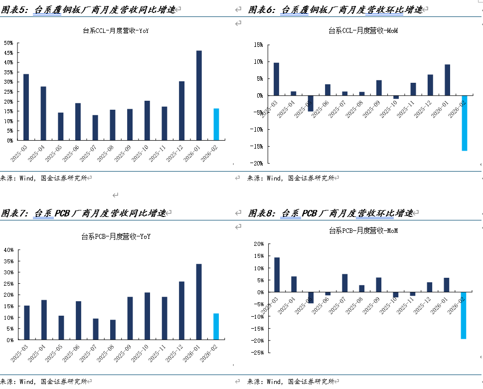 根据3月跟踪,整个产业链景气度判断为“保持高景气度”,主要原因来自于汽车、工控随着政策补贴加持同时AI持续大批量放量,PCB行业仍然处于同比高速增长的景气度中,2月环比下滑主要由于春节因素受限。从产业链跟踪来看,一季度保持较高的景气度状态,中低端原材料和覆铜板涨价均陆续涨价,但近期发生的地缘冲突使得原材料价格大幅上涨、宏观预期也变得复杂,建议保持密切观察。