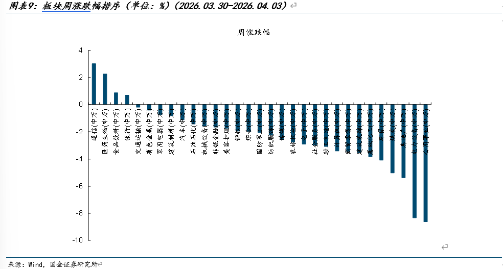 回顾本周行情,参考申万一级行业划分,涨跌幅前三名的行业分别为通信、生物医药、食品饮料,涨跌幅分别为3.01%、2.26%、0.87%。涨跌幅后三位为房地产、电力设备、公用事业,涨跌幅分别为-5.37%、-8.32%、-8.62%。本周电子行业涨跌幅为-2.92%。