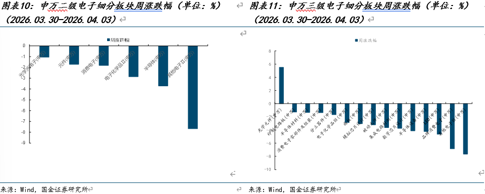 在电子细分板块中,涨跌幅前三大细分板块为光学元件、印制电路板、半导体材料,涨跌幅分别为5.52%、-1.28%、-1.33%。涨跌幅靠后的三大细分板块为LED、品牌消费电子、其他电子,涨跌幅分别为-4.65%、-6.86%、-7.67%。