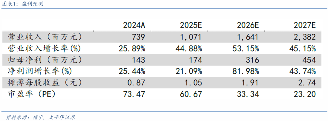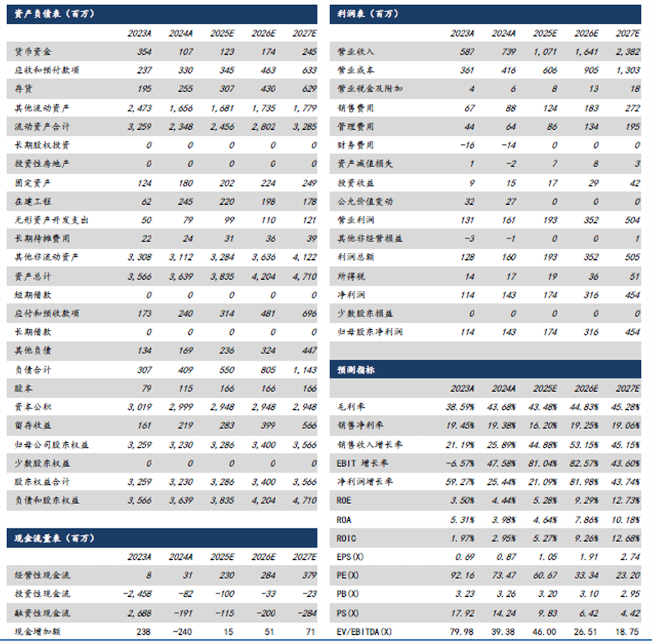 盈利预测与投资建议:预计2025-2027 年营业总收入分别为10.71、16.41、23.82亿元,同比增速分别 为44.88%、53.15%、45.15%;归母净利润分别为1.74、3.16、4.54亿元,同比增速分别为21.09%、 81.98%、43.74%,对应25-27年PE分别为61X、33X、23X,给予“买入”评级。