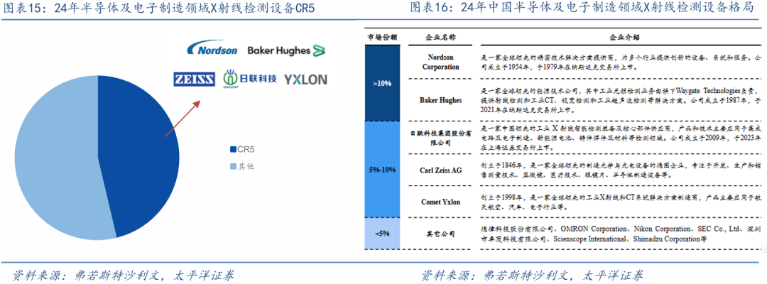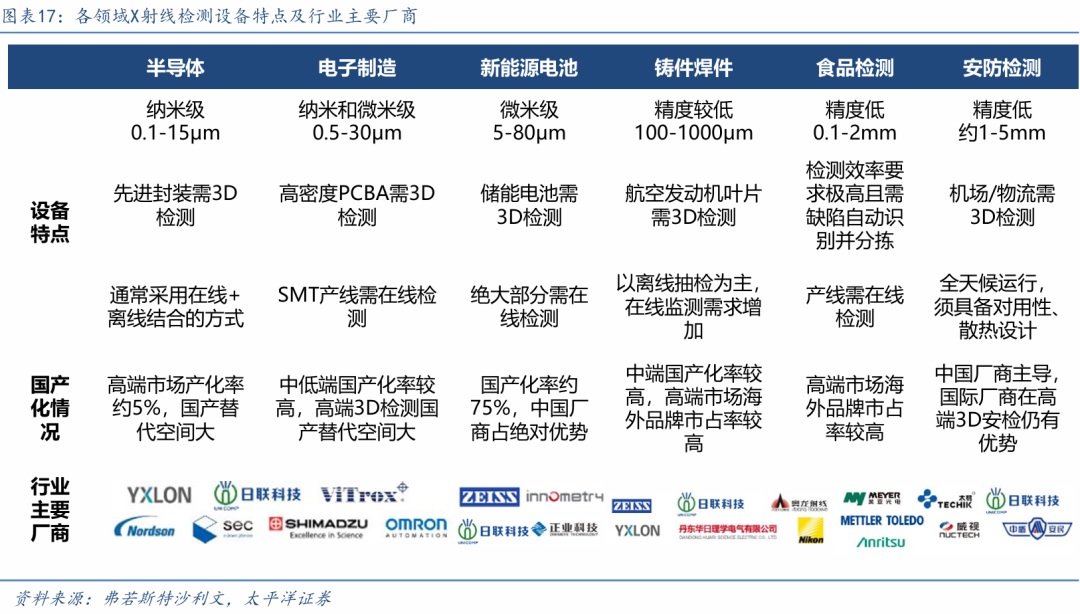 半导体及电子制造领域由海外厂商主导。半导体及电子制造领域对X射线检测设备的精度要求最为严苛,其中集成电路检测需达到纳米级精度,焦点尺寸要求0.1-15μm,电子制造领域覆盖纳米和 微米级,焦点尺寸要求0.5-30μm。相比之下,新能源电池领域为微米级5-80μm,铸件焊件领域 为400-1000μm。从国产化率看,半导体领域高端市场国产化率仅约5%,国产替代空间巨大;电子制造领域中低端市场国产化率相对较高,而高端3D检测仍存在国产替代空间。随着日联科技等国内企业技术突破,半导体及电子制造领域检测设备的国产替代正加速推进。