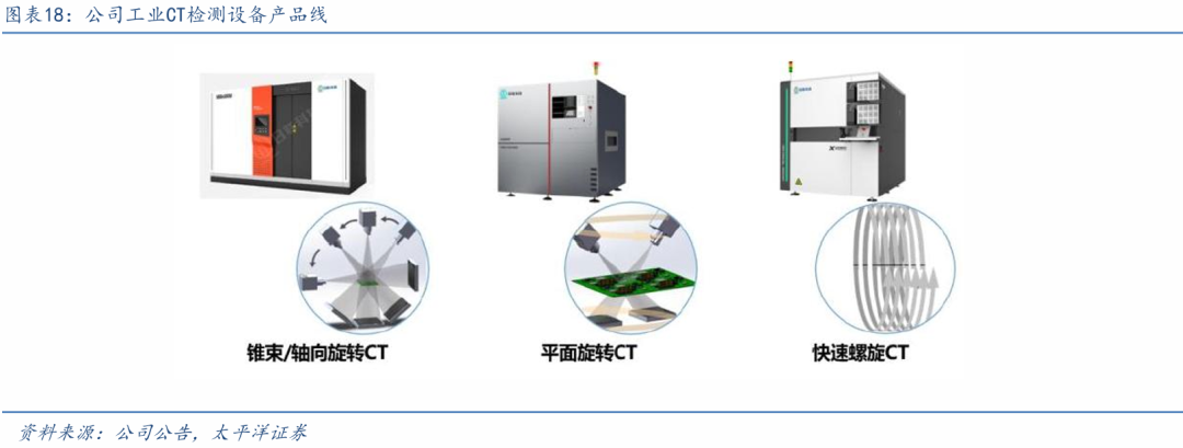 公司3D/CT检测技术等领域进展显著,伴随产品力提升,新签订单增速显著。公司持续进行设备开发迭代,各类标准化设备已有上百款,实现下游领域3D/CT检测技术全覆盖,设备价值量、竞争力持续提升。随着PCB制程工艺的不断提升,公司应用于PCB相关领域的工业X射线智能检测设备在检 测缺陷精度、检测厚度范围、检测影像维度等多方面均实现技术迭代升级。针对不同厚度PCB产品,公司可实现在线式或离线式亚微米级2D/2.5D/3D检测,持续为客户提供先进的工业X射线检测解决方案。