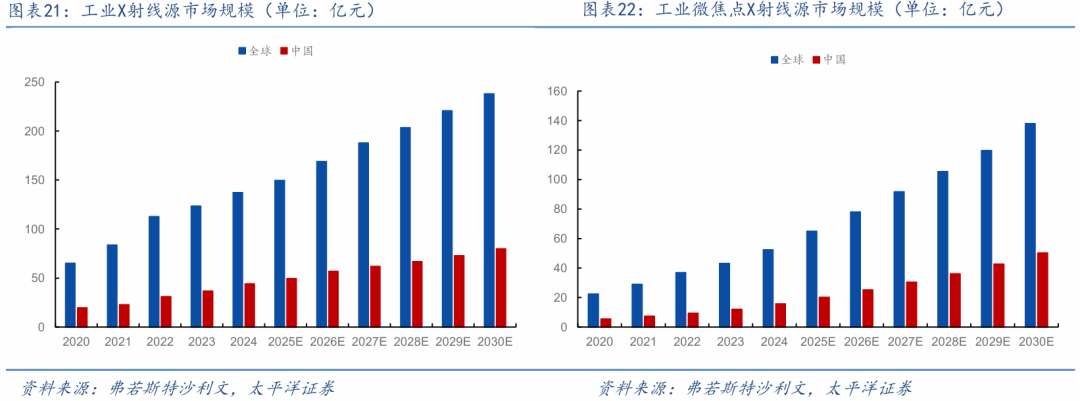 受先进封装和新能源等场景驱动,X射线源市场规模高速增长。根据沙利文数据,全球及中国工业X射线源市场持续增长,24年全球市场规模约为137.3亿元,中国市场约为44.1亿元;预计到30年,全球及中国工业X射线源市场规模将分别达到238亿元和80亿元,25年至30年的年复合增长率预计分别为9.7%和10.1%。其中,微焦点X射线源细分市场表现尤为突出,24年全球与中国市场规模分别为52.4亿元和15.8亿元,预计到30年将迅猛增长至137.9亿元和50.3亿元,年复合增长率高达16.3%和20.0%,主要得益于半导体先进封装、新能源电池等高精度检测需求的爆发式增长。
