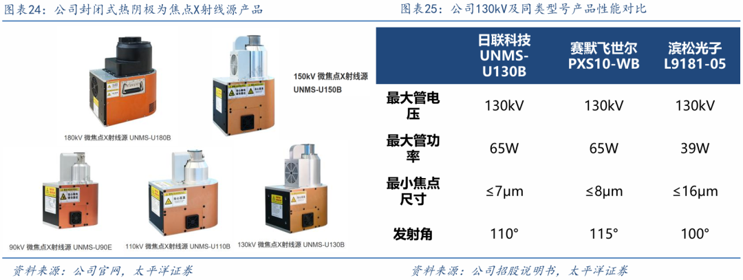 闭管式热阴极微焦点射线源打破海外垄断,技术水平国际先进、国内领先。在长期被海外垄断的封闭式热阴极微焦点射线源领域,公司已实现90kV/110kV/120kV/130kV/150kV/180kV等多种型号的闭管式热阴极微焦点射线源的量产和销售,批量应用于集成电路封测、电子制造SMT/PCB/PCBA、新能源电池等领域,在产品序列的丰富度上已经对标国际龙头日本滨松光子和美国赛默飞世尔。与同类型号产品如赛默飞世尔PXS10-WB和滨松光子L9181-05相比,公司130kV产品在最大管电压、最大管功率、最小焦点尺寸和发射角等关键参数均达到或优于国际龙头同类产品。