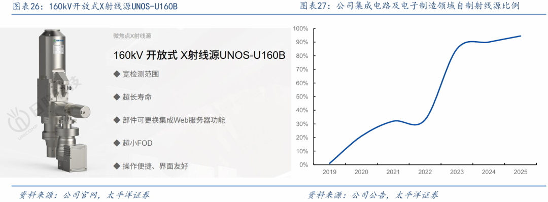公司发布国内首款纳米级开管射线源,自产射线源的比例提升。公司在X射线源产品线布局不断拓展,除了闭管微焦点射线源,在开管射线源、大功率射线源等多类型射线源全谱系覆盖,纳米级开管射线源和大功率射线源等新产品实现产业化。公司推出国内首款纳米级开管射线源UNOS-U160B小批量出货,解决Wafer Bump、2.5D/3D封装、MEMS制造、焊点连接等缺陷的高精度检测难题。公司设备配套自制射线源比例增长显著,在集成电路及电子制造领域,到25H1应用自产射线源的比例高达94.30%,显著提升了其X射线智能检测装备的毛利率与定制化能力。