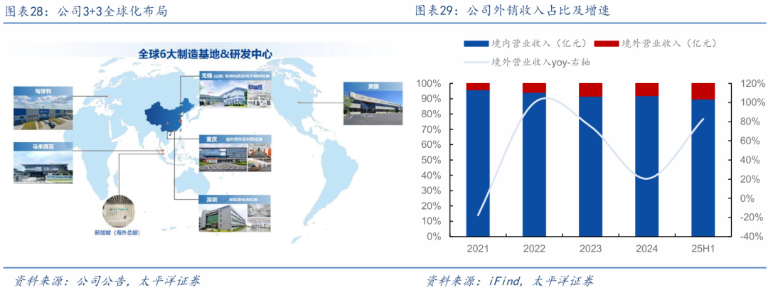 全球化布局的战略成效逐步凸显,海外收入兑现可期。公司加速推进全球化战略,前瞻性打造“3 3全球产能布局”,在国内拥有无锡、重庆、深圳三大研发及生产基地,并在新加坡设立海外总部,在马来西亚、匈牙利、美国成立研发及生产基地,全球化布局已初具规模。同时,公司进行了一系列关键的外延并购,增强全球化战略布局,如25年1月投资美国创新电子并成立合资公司,深化美洲渠道,25年10月收购新加坡半导体高端检测与失效分析设备龙头SSTI的66%股权。25年上半年,公司海外收入占比超过10%,同比增长82.82%,全球化布局的战略成效逐步凸显。