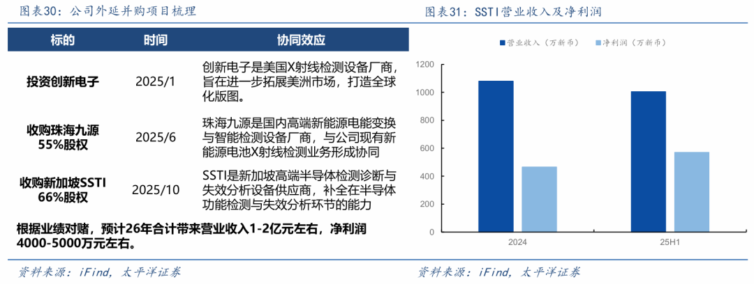 外延并购再下一城,目标工业检测综合平台。公司全资子公司新加坡瑞泰收购SSTI的66%股权,SSTI是新加坡高端半导体检测诊断与失效分析设备供应商,如光子发射显微镜(PEM)、激光时序探针(LTP)等。在产品业务方面,SSTI在光子发射检测、激光时序探针检测、热红外检测等技术领域具备国际先进水平,与公司现有的先进X射线检测技术形成高度互补,为客户提供“物理缺陷检测 功能检测分析”的一站式半导体检测解决方案。根据业绩承诺,SSTI承诺26-28年平均每年税后利润不低于1140万元新币。