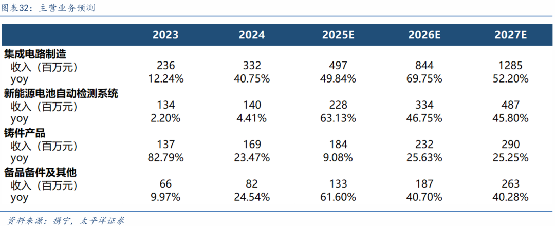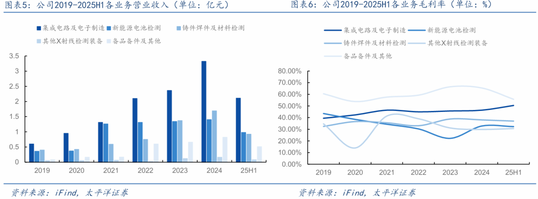 集成电路及电子制造X射线智能检测设备贡献主要营收。公司X射线智能检测设备,25H1实现收入 4.09亿元,同比增长40.67%。分业务看,集成电路及电子制造检测设备为收入基本盘,25H1收入 2.11亿元,同比增长54.63%,占设备收入52%;新能源电池检测设备收入0.98亿元,同比增长 69.17%,占比24%;铸件焊件及材料检测设备收入0.92亿元,同比增长1.21%,占比22%;备品备件 及其他业务收入0.51亿元,同比增长22.59%。25H1集成电路检测设备/新能源电池检测设备/铸件 焊件检测设备/备品备件的毛利率分别为50.42%/32.27%/37.01%/55.71%。