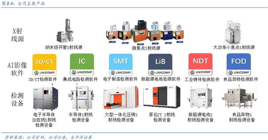 公司主要产品包括X射线源、AI影像软件和工业X射线智能检测设备全产业链产品。