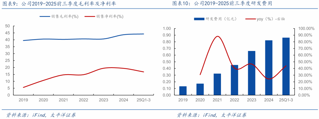 公司盈利水平维持高位,持续研发投入强化技术壁垒。公司近年来毛利率水平稳健,25年整体维 持历史高位小幅波动,25年前三季度销售毛利率为44.23%,同比微降0.98pct;25年前三季度销售 净利率为16.81%,同样维持在历史高位水平,同时,公司持续强化技术壁垒,增加研发投入,25 年前三季度研发费用0.86亿元,同比增长43.9%,研发费用率11.70%,公司持续加大研发投入,推 进开管射线源、大功率射线源等高端产品技术攻坚,巩固核心竞争优势。