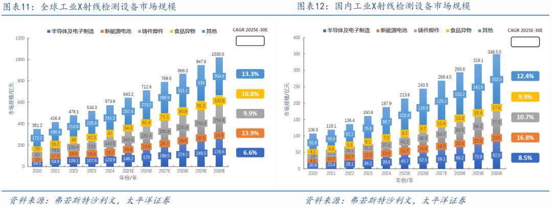 受益于半导体先进制程扩产、新能源电池产能扩张以及汽车轻量化等下游需求驱动,全球工业X射线检测设备市场持续扩容,国产化进程加速。根据沙利文数据,20-24年全球工业X射线检测设备市场规模从351亿元增长至574亿元,年复合增长率达13.1%,预计到30年,全球市场规模有望突破千亿元,25-30年复合增长率约9.9%。国内市场增速高于全球,20-24年中国工业X射线检测设备市场规模从107亿元增长至188亿元,年复合增长率达15.1%。受益于国产替代进程加速及下游应用领域持续拓展,预计到2029年国内市场规模将突破300亿元,25-30年复合增长率约10.3%。