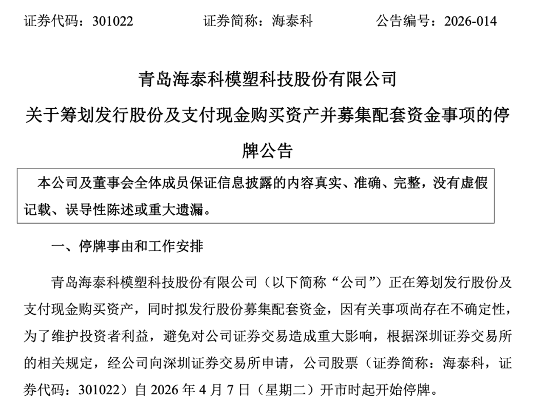 “A股收新三板”又添一例,海泰科筹划购买旭域股份控制权,明起停牌。海泰科(301022)4月6日晚间公告称,公司正筹划以发行股份及支付现金相结合的方式,购买新三板挂牌公司青岛旭域股份(873815)控制权,同时拟发行股份募集配套资金。因相关事项存在不确定性,海泰科股票自4月7日开市起停牌。公司预计在不超过10个交易日的时间内披露本次交易方案,最晚将于4月21日披露相关信息并复牌。若本次交易终止,公司承诺自披露相关公告之日起至少1个月内不再筹划重大资产重组事项。公告显示,本次交易事项尚处于筹划阶段,初步确定的交易对方为旭域股份实际控制人杨宝和在内的标的公司全部或部分股东。本次交易预计不构成关联交易、不构成重大资产重组及重组上市,亦不会导致公司实际控制人发生变更。海泰科成立于2003年,2021年于创业板上市,公司主要产品为注塑模具及塑料零部件,产品目前主要应用于汽车行业等领域。业绩预告显示,2025年公司预计实现归母净利润5150万元至6680万元,同比增长226.86%至323.97%;预计实现扣非净利润3700万元至4800万元,同比增长353.3%至488.06%。对于业绩变动的原因,海泰科表示主要受益于行业较高景气度及公司首发募投项目产能逐渐释放,公司订单持续增加,公司持续深化成本管控等。报告期内,公司非经常性损益对上市公司归母净利润的影响金额约1800万元。本次交易标的——旭域股份,于2000年成立,2022年9月在新三板创新层挂牌,公司主营业务为土工合成材料研发、生产与销售,是国家级专精特新“小巨人”企业。2025年,旭域股份实现营业收入2.8亿元,同比增长27.8%;归母净利润4357.7万元,同比增长25.34%。截至2025年末,公司资产总额4.19亿元,净资产2.49亿元。2026年以来并购重组市场持续升温,“A股收新三板”的案例持续涌现,大多围绕产业链协同展开。年初,得邦照明披露拟以14.54亿元收购嘉利股份67.48%股权的重组方案,进一步拓展车载照明业务布局;3月,银轮股份公告持续推进对深蓝股份的收购事宜,在已持有43.22%股权的基础上,拟以1.33亿元,通过协议转让、定增等方式实现绝对控股。