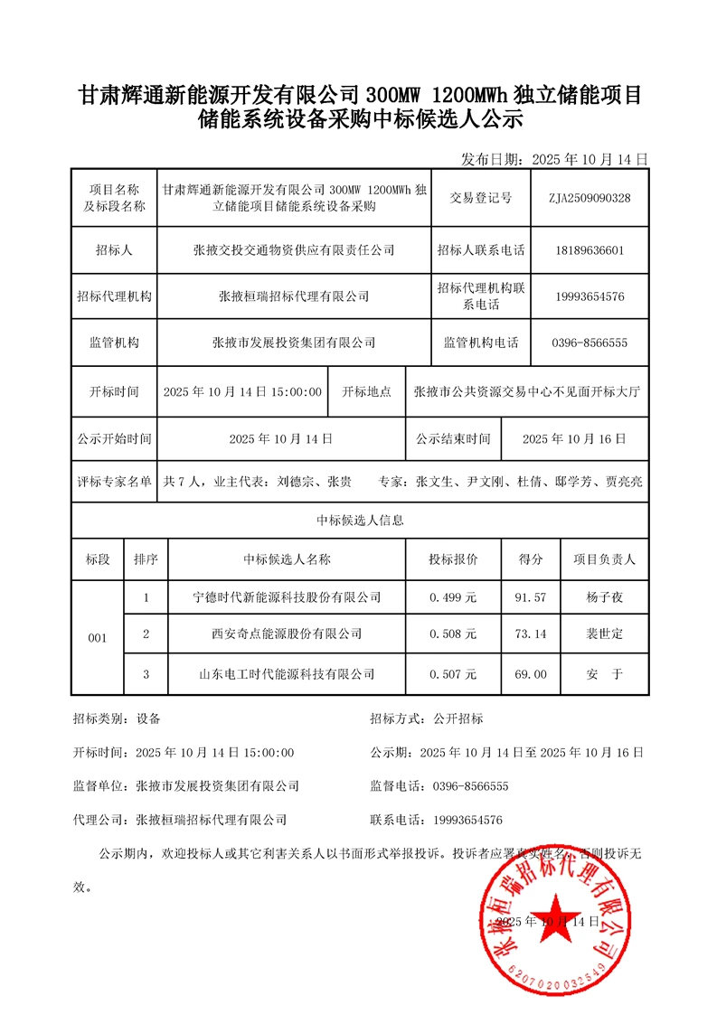 据中工汽车网获悉,10月14日,甘肃辉通新能源开发有限公司300MW/1200MWh独立储能项目储能系统设备采购中标候选人公示,中标候选人报价范围0.499—0.508元/Wh。其中,宁德时代以0.499元/Wh预中标1.2GWh储能设备采购。
