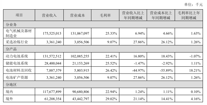 在细分产品上,宁德时代储能电池系统实现营收284亿元,同比下降1.47%。储能电池系统毛利率25.52%,同比增长1.11%。主要受国内强制配储政策取消后的短期调整影响,但公司通过技术创新和海外市场拓展,储能电池产量仍位列全球第一;动力电池系统实现营收1315.73亿元,同比增长16.80%。动力电池系统毛利率22.41%,同比下降1.07%。