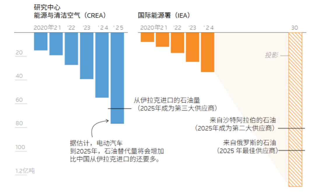 新能源汽车的爆发式增长,正在让中国摆脱对石油的依赖。据能源与清洁空气研究中心(CREA)测算数据显示,2025年中国电动汽车每年替代的石油消费量,已超过中国从伊拉克进口的石油总量,每年可节省约280亿美元石油进口开支。更具战略里程碑意义的是,中国公路与航空运输的汽柴油消费量已于2023年达到峰值,标志着传统燃油需求正式进入不可逆的下行通道。