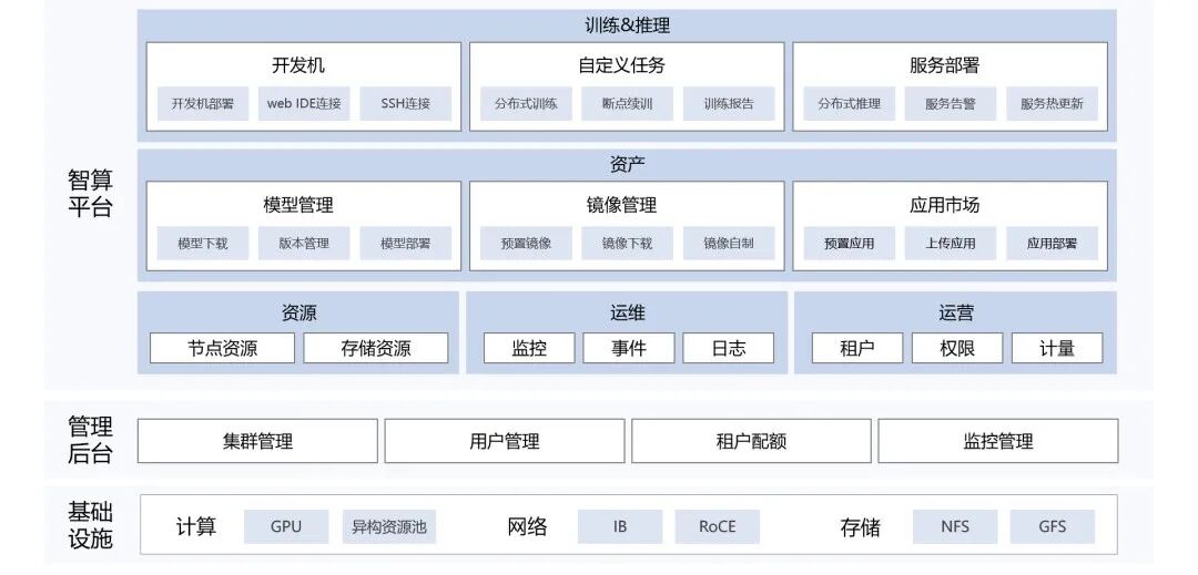 - 智能调度,资源高效利用:通过智能调度算法,盘活闲置算力资源,提供可视化资源管理界面,提升整体算力利用率。