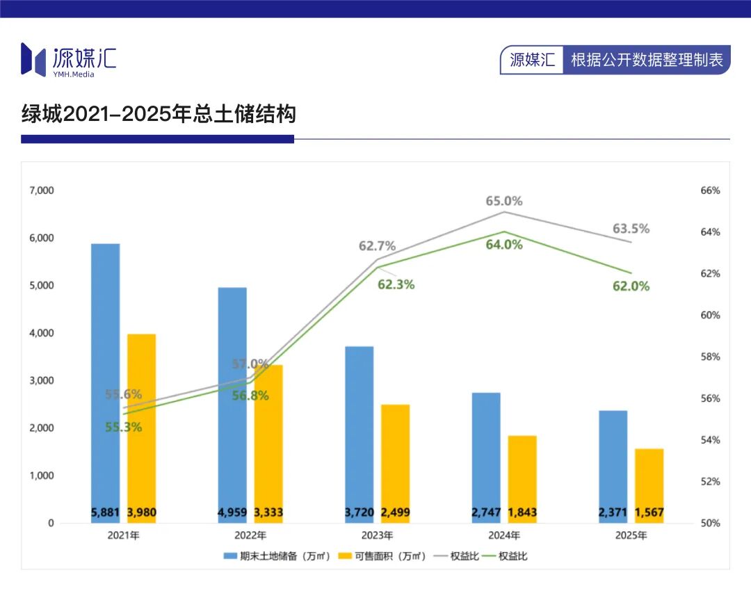 2025年末,绿城土储总建面约2371万㎡,权益比为63.5%,相较2021年,总建面减少59.7%,权益比提升近8个百分点。同时,可售面积为1567万㎡,权益比为62%,较2022年分别减少60.63%,提升6.个百分点。