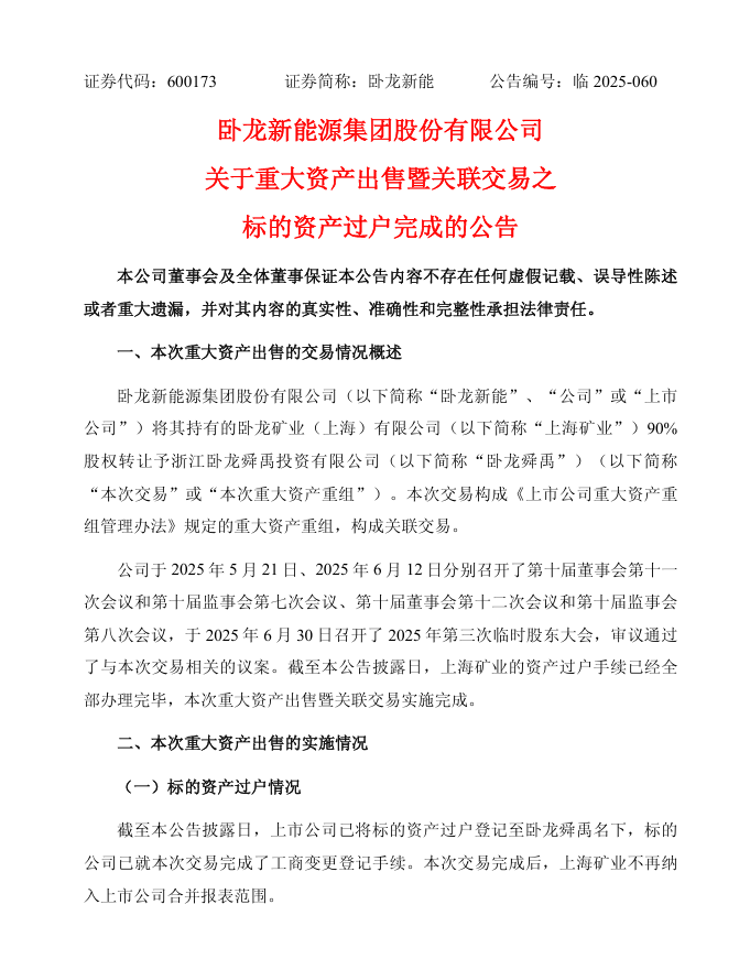 储能知家讯,4月2日,中信建投证券发布关于卧龙新能源集团股份有限公司重大资产出售暨关联交易之2025年度持续督导意见。公告显示,卧龙新能向间接控股股东卧龙控股的全资子公司卧龙舜禹出售其持有的上海矿业90%股权事项已顺利完成过户及对价支付,上海矿业不再纳入上市公司合并报表范围。
