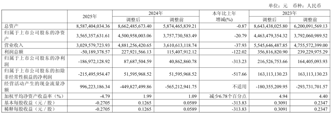 2025年全年,公司实现营业收入30.30亿元,同比下降37.93%。其中,新能源板块实现营收8.58亿元;归母净利润为-1.87亿元,同比下降313.23%,是上市以来首次年度亏损;扣非归母净利润为-2.15亿元,同比下降517.66%;基本每股收益-0.2705元/股。