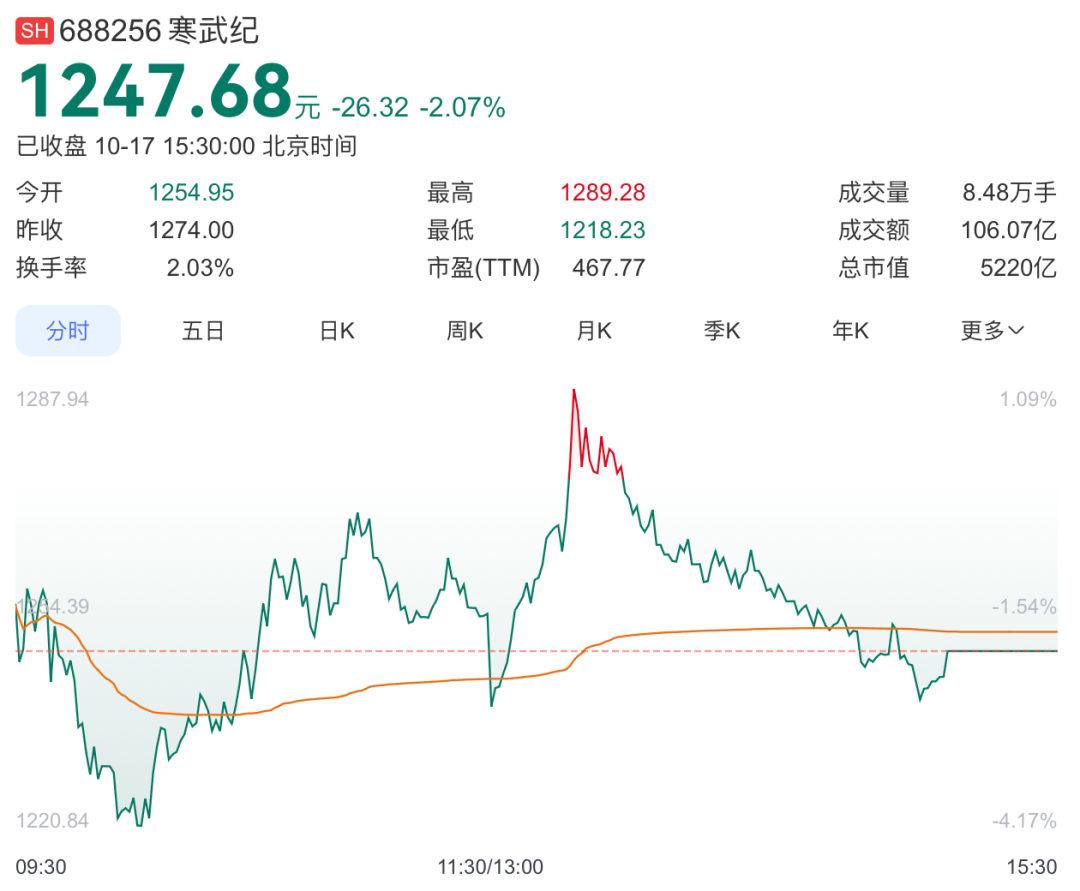 行情方面,截至10月17日收盘,寒武纪股价报1247.68元/股,总市值5220亿元。