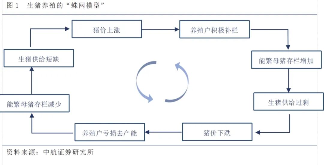 生猪价格周期性波动符合经典的农产品“蛛网模型”,该模型揭示了生产决策与市场供给之间的时间错配。具体而言,猪肉价格上涨驱动养殖户补栏,能繁母猪存栏增加,但受制于10-12个月的生物周期,供给在远期才能集中释放,导致生猪由短缺转为过剩,价格随之下跌;猪价下跌使养殖户陷入亏损并加速去产能,供给收缩推动猪价再次上涨。周而复始,构成了生猪市场的周期性波动特征。