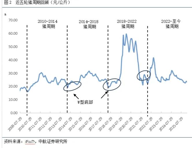相比于传统猪周期,2022年至今的猪肉价格走势不再呈现“单峰”形态,而是在2022年10月和2024年9月分别呈现两个高点,具有“双峰”特点。