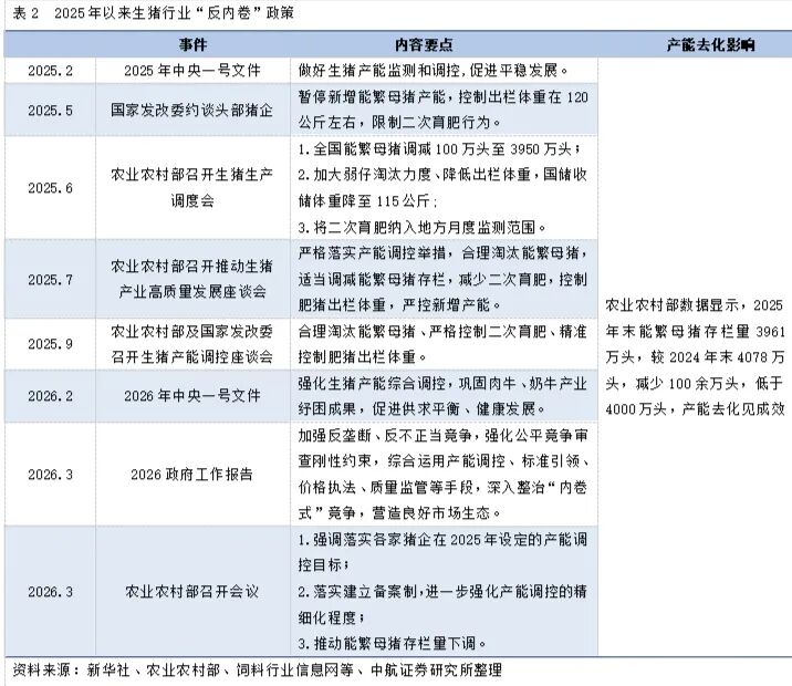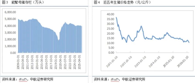 自2025年以来,生猪行业“反内卷”政策密集落地,政策要求合理调减能繁母猪、减少二次育肥、加大弱仔淘汰、控制出栏体重、严控扩张产能等内容,核心目标是通过行政引导产能供给水平适度合理的调减。在政策引导与市场亏损双重压力下,行业自三季度起启动产能去化。据农业农村部数据,2025年末全国能繁母猪存栏下调至3961万头,同比减少116万头,产能调控初见成效。同时,市场供给宽松格局贯穿全年,猪价呈现震荡下行态势,从25年初的16.1元/公斤逐渐跌至四季度11—12元/公斤,下半年出现“旺季不旺”特征。