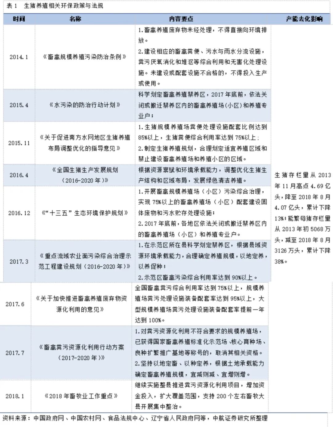 2014到2018年之间,我国陆续出台《畜禽规模养殖污染防治条例》、《全国生猪生产发展规划(2016-2020年)》和《2018年畜牧业工作重点》等环保养殖政策,通过划定禁养区、强制配套粪污处理设施、关停搬迁不合规养殖场等举措,显著抬升行业准入门槛,推动散户及中小养殖场加速退出。