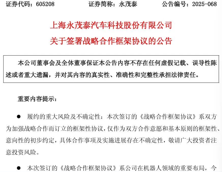 此外,本次签订的《战略合作框架协议》系永茂泰在机器人领域的重要布局,今年以来,虽然机器人行业呈现蓬勃发展态势,但机器人未来大规模普及消费尚存在不确定性,且双方未来合作受技术认证流程、生产进程、市场竞争及宏观经济形势等因素影响,存在极大的不确定性。