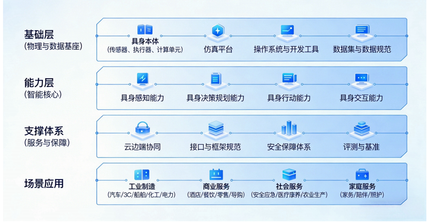 具身智能作为人工智能与机器人学以及生命科学、工材等多学科多领域融合的前沿领域,其技术架构与场景应用可系统划分为基础层、能力层、支撑体系层和场景应用层。各层级相互支撑、协同进化,共同推动具身智能从实验室走向真实世界。