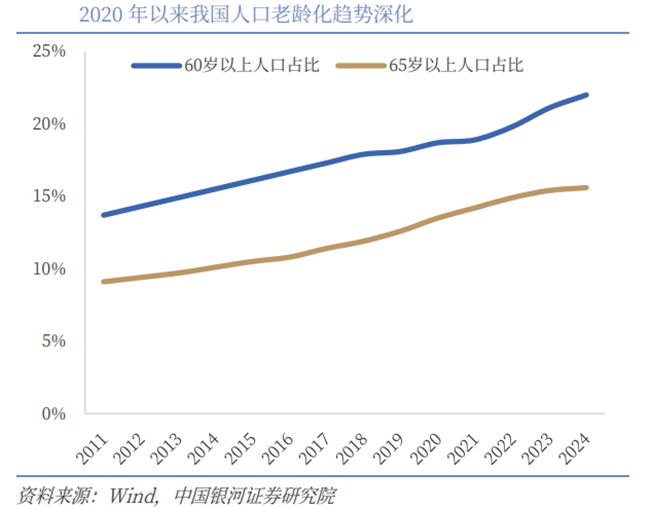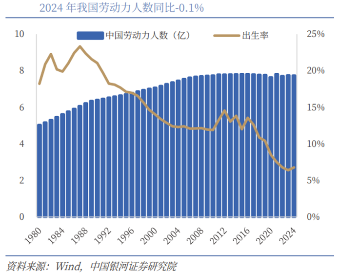 中国市场劳动力人口增长放缓、出生率下滑叠加人口老龄化深化,劳动力边际递减趋势带来机器人需求提升。据世界银行数据,2024年我国劳动力人数为7.7亿人,同比-0.1%,20世纪以来我国劳动力人口增长呈现明显放缓趋势。据国家统计局数据,2024年我国人口出生率为6.8%,60岁及以上人口占比为22.0%,同比 0.9pct,65岁及以上人口占比为15.6%,同比 0.2pct,2020以来我国人口出生率中枢降低至10%以下,持续走低,我国人口老龄化趋势进一步深化,我国劳动力人数面临边际抵减趋势,带来劳动力市场对以机器人为代表的自动化设备的需求提升,以弥补劳动力人口的缺失。