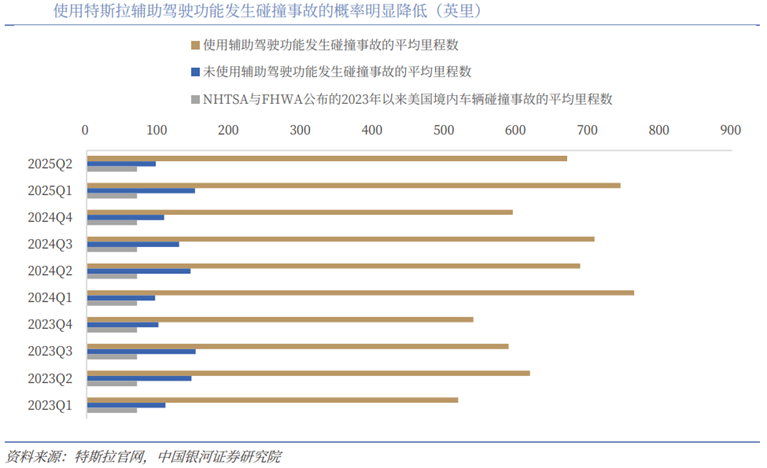 具身智能技术成熟发展能够提升生产效率、优化生活体验、减少安全事故,市场需求提升空间十足。在工业场景下,具身智能机器人的工作时长、操作精准度等均较人工具有优势,能够起到提高生产效率的作用,且能够减少工业事故对人身生命安全的威胁;在服务业场景下,具身智能机器人的使用可以提升生活便捷程度,优化生活体验;在交通场景下,以智能辅助驾驶为例,不仅能够减低驾驶员的疲劳程度,还能够提升驾驶安全,据特斯拉车辆安全报告,在使用辅助驾驶功能的情况下发生碰撞事故的平均里程数在500英里以上,远高于不适用辅助驾驶的场景(100英里左右),大幅提升车辆驾驶安全。