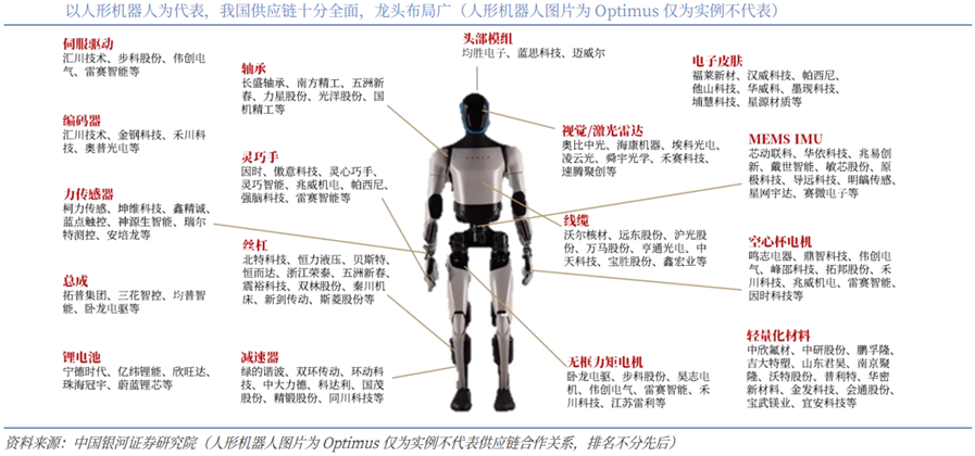 若具体到人形机器人领域,中国供应链已具备明显领先能力:1)最上游的原材料环节,高性能电机离不开稀土永磁等资源,中国拥有全球40%资源储量与92%冶炼分离产能;2)中游零部件制造环节,受益于其他技术同源性较强的成熟行业(汽车行业最为典型)发展成果,国内供应链布局十分全面,高功率密度电机、谐波/行星减速器、模组、六维力矩与IMU/深度相机等传感器、高比能电池在国内均有龙头供应商选择,国产化率高,能迅速搭建产品原型;此外,大规模量产已积累丰富的工程化、生产管理运营经验,为后续降本,形成极致性价比优势,从而加速应用拓展打下基础。展望后续,与主机厂合作紧密、具备强技术实力、规模化生产经验丰富是零部件企业竞争的三大核心基本要素。