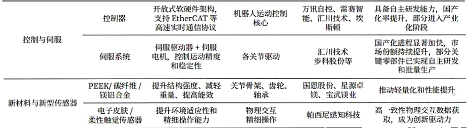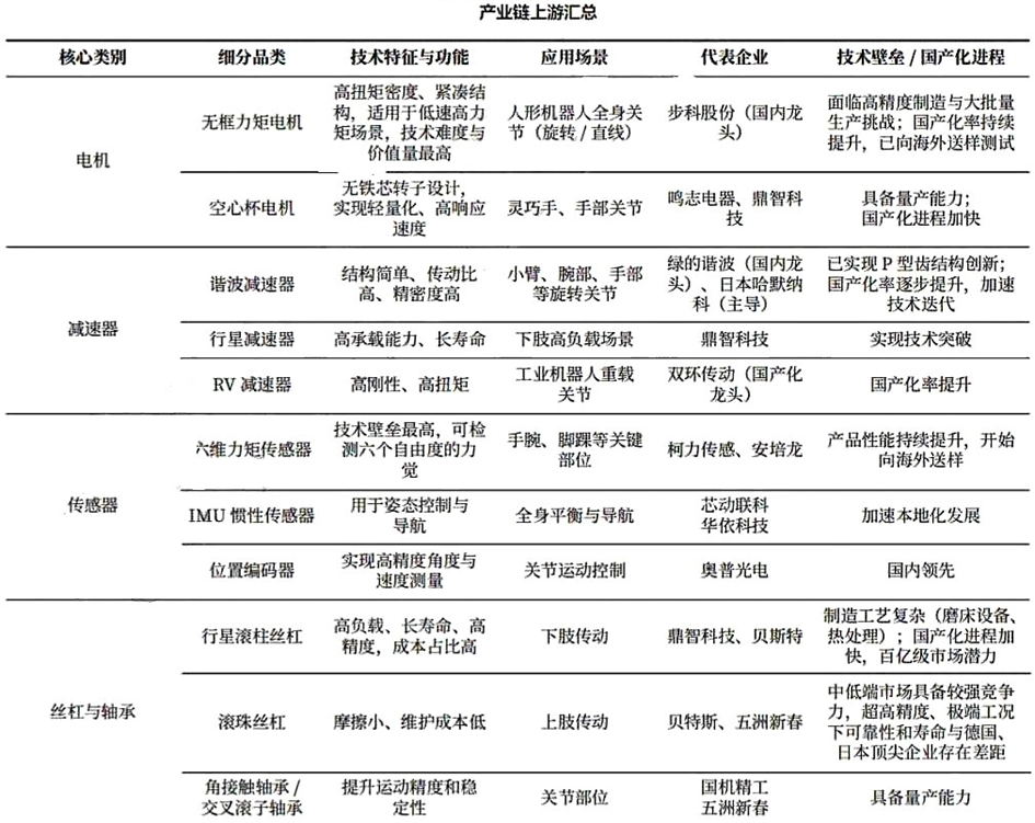 具身智能产业链上游已形成涵盖电机、减速器、传感器、丝杠轴承、控制伺服,以及新材料等的技术体系,国内企业在无框力矩电机、谐波减速器、六维力传感器等高壁垒环节实现显著突破,国产化进程加速,核心零部件自主可控能力持续增强,为产业规模化发展奠定了坚实基础。