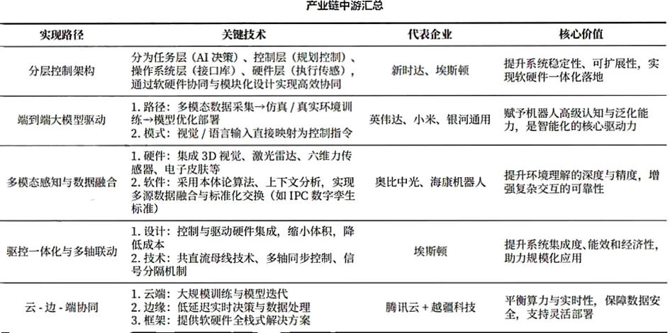 中游环节聚集了大量本体制造和系统集成企业,形成了以上海、深圳、苏州等为代表的区域产业集群。2023年,上海浦东机器人产业规模超过200亿元,集聚人工智能重点企业超600家,规上人工智能企业产业规模超1400亿元。2023年,深圳机器人产业链总产值达1797亿元,企业数量近6万家,产业链完整,涵盖本体制造、系统集成和零部件配套9;苏州吴中区“机器人 智能制造”企业超千家,2023年产业规模达1369.3亿元,全国六成以上的服务机器人产自吴中区,全国七分之一的内资品牌工业机器人来自吴中区。本体制造和系统集成的主流技术路径包括分层决策模型、大模型驱动端到端集成、多模态感知融合,以及云边端协同架构等。