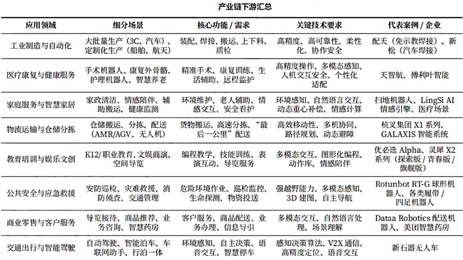 具身智能产业链下游应用场景广泛,涵盖工业制造、医疗康复、家庭服务、物流运输、教育娱乐、公共安全、智慧养老与智慧医疗、商业零售、交通出行等细分领域。各场景推动多机器人协作和跨模态融合,实现具身智能产品的多样化落地与规模化应用。