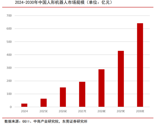 在政策、技术与资本涌入多重利好的驱动下,中国人形机器人市场正处在产业化落地的关键阶段,未来发展可期。根据GGII和中商产业研究院的统计,2024年中国人形机器人市场规模约为25.62亿元,预计中国人形机器人市场规模将从2025年的约63.39亿元增长至2030年的642.22亿元,年均复合增长率达58.90%。