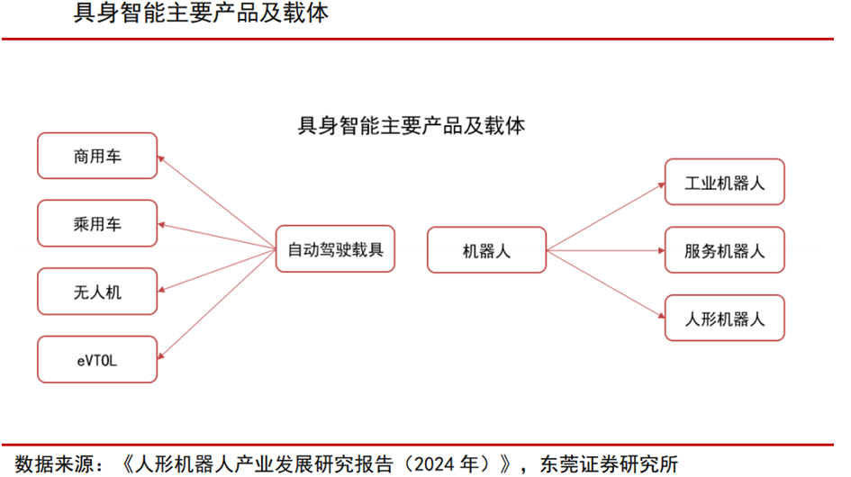 具身智能产业链覆盖上游硬件与软件到下游应用。上游以核心零部件与技术基座为核心,包括AI芯片、各类传感器、伺服电机、减速器等核心零部件等。中游聚焦整机集成与算法开发,主要产品为机器人与自动驾驶载具。下游主要为各种应用场景,包括工业制造领域、物流配送、医疗康复、家庭服务等场景。