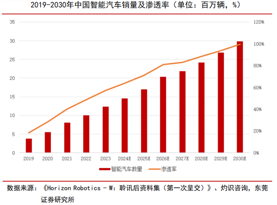中国智能汽车销量及渗透率持续增长。中国是全球最大的乘用车新车市场,2023年的新增乘用车销量为21.7百万辆,其中智能汽车为12.4百万辆,渗透率达57.1%。根据灼识咨询的资料,预计到2026年及2030年,中国智能汽车销量将分别达到20.4百万辆及29.8百万辆,渗透率分别达81.2%及99.7%。中国OEM,尤其是中国新能源汽车OEM,在采用高阶自动驾驶解决方案这一趋势中走在前列。预计到2027年,中国乘用车部署的驾驶自动化解决方案中将有接近一半是高阶自动驾驶解决方案,而到2030年,此比例将进一步提高到80%以上,远快于高阶自动驾驶解决方案在全球市场的渗透速度。