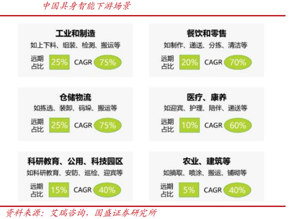展望未来几年,具身智能产业规模有望随着应用场景的多元而取得快速增长。全球范围来看,Trendforce预计,2026年将是人形机器人迈向商用化的关键年,全球出货量可望突破5万台,年增逾700%。其中,Trendforce认为,日本市场或以“健康照护”为重要需求场景,美国市场或在“制造、物流”场景大规模部署,中国市场则在“制造、陪伴、消费级”多元场景布局。中国市场中,艾瑞咨询预计,未来10年具身智能市场有望较2025年实现百倍增长,达到2000-3000亿人民币市场规模。其中,工业制造、仓储物流、餐饮零售、科研公用等有望成为普及场景。