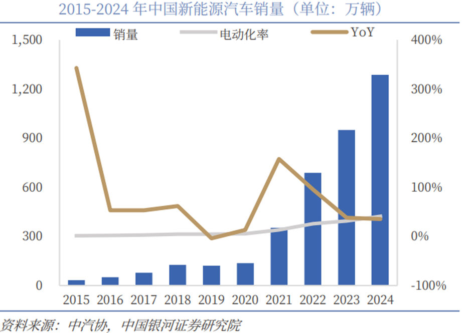 政策引领下,中国发展新兴产业取得斐然成果。中国政策举旗定向,“政企合力办大事”经验丰富,政策定力、执行力与规划力,构成中国国家级操作系统基座,中国在战略性新兴产业上的顶层设计强调目标清晰、路径分解与责任压实,具备跨部门统筹与分区试点的组织能力,能把不确定的前沿技术转化为可落地的工程化路线。以“十三五”、“十四五”经验来看,我国新能源汽车产业、数字基础设施建设、“双碳”战略均取得显著成绩:2024年我国新能源汽车产销分别达1289万/1287万辆,电动化率41%,连续10年全球第一;截至2024年底5G基站425万座,占比34%,遥遥领先全球;截至2024年底光伏发电累计装机886GW,“十三五”至今CAGR高达40%。