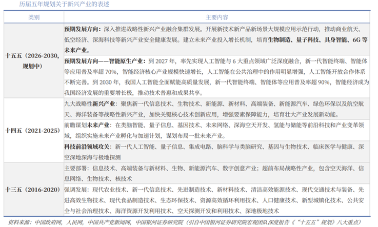 科技创新仍是“十五五”重要命题。回顾过去十年的规划文件,可以看到“创新驱动发展”的延续性,“十四五”规划更是将科技创新、现代化产业升级提至最高优先级,单列一章“发展壮大战略性新兴产业”。为实现中国现代化升级改革、重塑经济增长的底层逻辑,“十五五”规划必将在历史基础上进一步强调科技创新重要性,强化新质生产力地位。