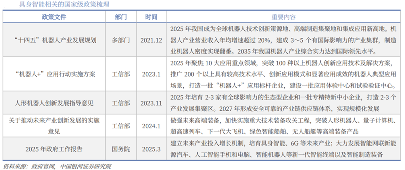 “十四五”重磅政策密集发布,积极看“十五五”。“十四五”时期,中国具身智能相关方向纳入国家发展主线,构建了“核心技术攻关—示范应用—产业集群—标准体系—人才工程”框架,措施表述全面:以重大专项牵引关键部件攻关,以示范应用拉动整机可靠性爬坡,以创新平台和标准规范确保安全可控与互联互通,以财政金融工具和政府采购降低初期部署成本与试错成本。2023年底工信部发布《人形机器人创新发展指导意见》,对人形机器人这一具身智能“终极载体”首次提出明确规划;2025年具身智能更是首次进入政府工作报告并被列为未来产业,积极看好“十五五”规划中具身智能表述将得到持续增强。