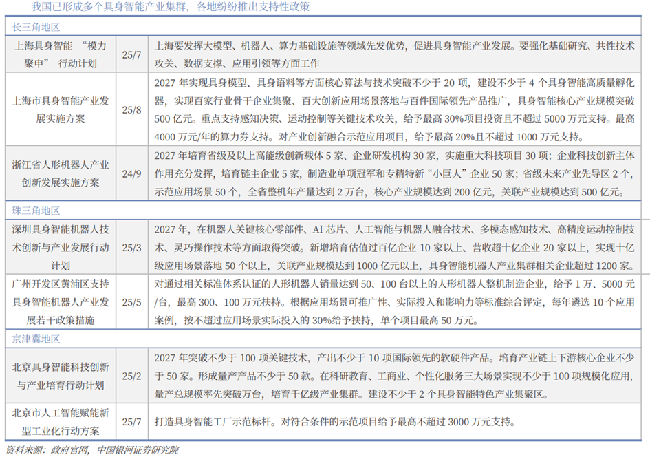 各地政策同频共振,产业集群效应显现。近一年已有多个省市行政区发布具身智能相关政策。其制定目标更细化、更落地,具体支持举措包括实际补贴、税收优惠、算力资源倾斜、人才吸引等,各地共性在于均重视应用场景的开发与示范,此外对算法模型、硬件供应链布局关注度高。目前,国内已形成长三角、珠三角、京津冀、成渝四大核心产业集群,以及武汉、合肥等新兴集聚区,地方性平台更好地实现了区域资源共享、产学研合作加深。上海、北京等地成立的数据采集中心成为一大地区性发展特色,紧密结合当地产业链布局和特色,充分发挥各地优势,加速具身智能技术在不同领域的落地应用,同时也成为了批量采购人形机器人、推动量产的重要角色。