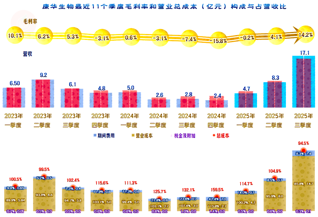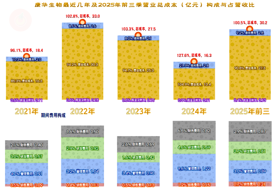 康华生物的期间费用在2亿多元,由于营收的规模波动比较大,占营收比波动也很大。就算营收最高的2022年,其占比也是8.1个百分点,2025年前三季度为9.2个百分点,也就是说,毛利率低于这个水平,亏损的可能性就非常大。