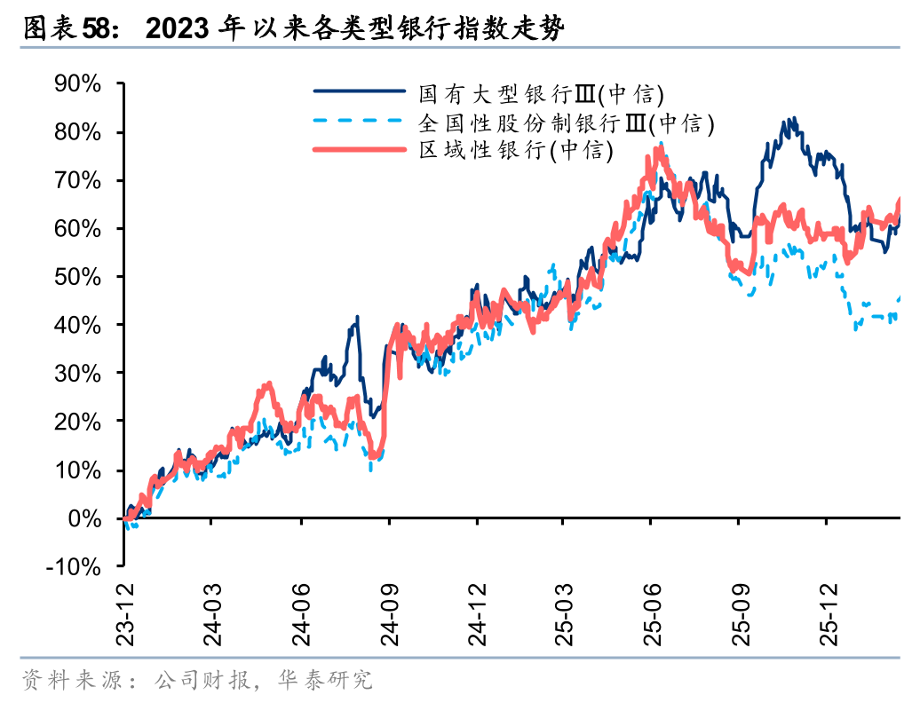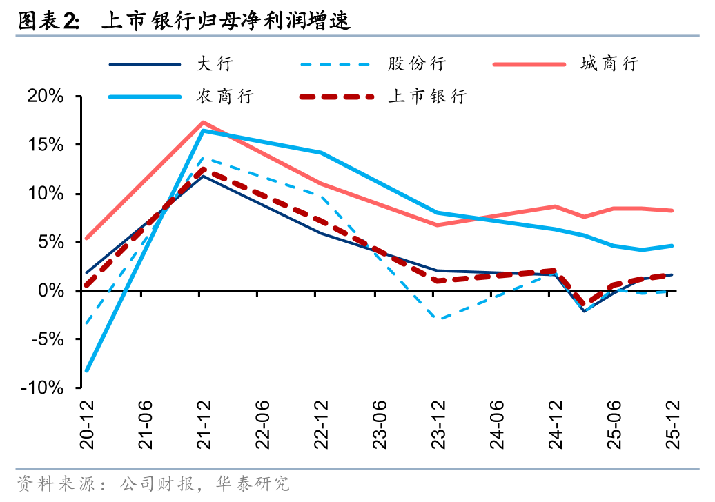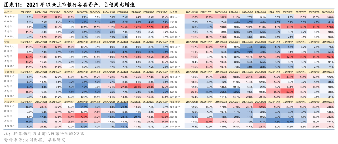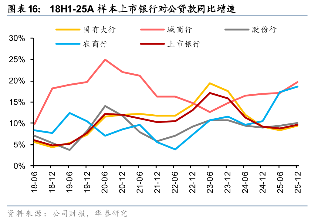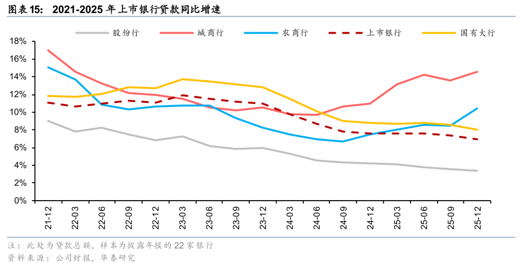 信贷增长放缓,银行内部表现有所分化。25年末上市银行贷款同比 6.9%,增速较9月末下滑0.4pct。内部看各类银行表现有所分化,城农商行相对更具韧性。25年末大行、股份行、城商行、农商行同比增速较9月末-0.5pct、-0.2pct、 1.0pct、 1.9pct至8.0%、3.4%、14.5%、10.4%。部分植根优质区域的城农商行仍表现出较强的扩张动能,如重庆、青岛、瑞丰贷款增速仍保持在10%以上。
